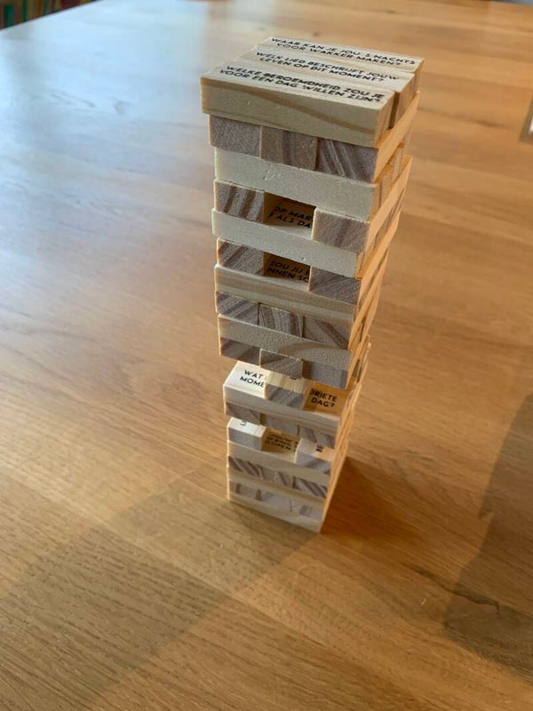 54 houten stenen bedrukt met originele vragen. Een leuke activiteit die gepaard gaat met het beter leren kennen van je spelpartner. Durven jullie elkaar eerlijk antwoord te geven?