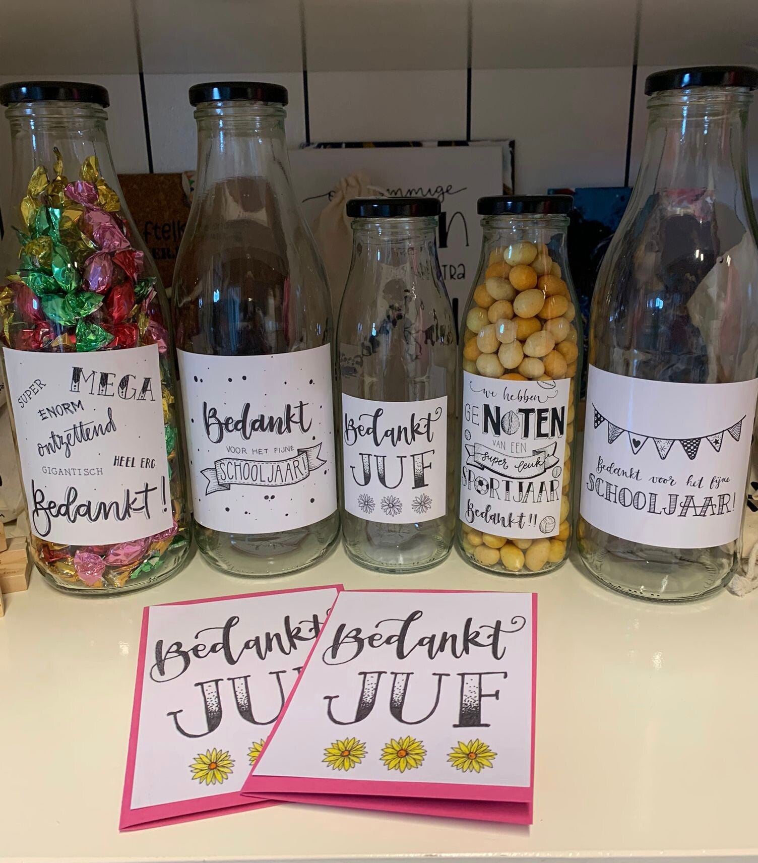 Een glazen fles met een persoonlijk zelfgemaakt etiket is een perfect cadeau voor een meester of juf. Een persoonlijk etiket met een zorgvuldig gekozen inhoud maakt dit cadeau uniek en waardevol.